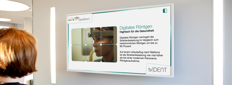 tv DENT steht für nachhaltiges und erfolgreiches Marketing in Zahnarztpraxen. Entwickelt von führenden Zahnärzten und deren Patienten in Zusammenarbeit mit den Experten für Digital Signage TV Netzwerke.